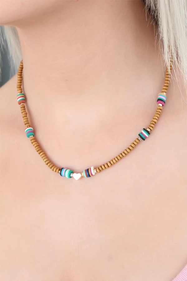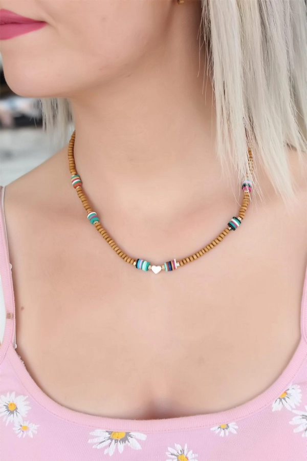 Taba Rengi Boncuklu Kalp Detaylı Bayan Kolye